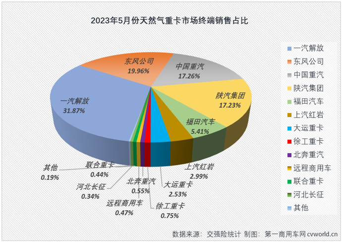 從市場份額看,5月份天然氣重卡市場有4家企業(yè)份額超過10%,其中排名首位的解放月度份額繼續(xù)超過30%,達到31.87%,較上月(31.12%)還有所提升;東風以2260輛的表現(xiàn)躍居月銷量榜次席,月度份額達到19.96%;排名月榜第3、4位的重汽和陜汽5月份分別實銷天然氣重卡1954輛和1951輛,月度份額分別為17.26%和17.23%,相差僅3輛;排名月榜第5位的福田汽車5月份實銷天然氣重卡612輛,月度份額5.41%;排名月榜第6、7位的上汽紅巖和大運重卡5月份分別實銷天然氣重卡338輛和286輛,月度份額分別為2.99%和2.53%,相差不足60輛;其他企業(yè)銷量均不足百輛。